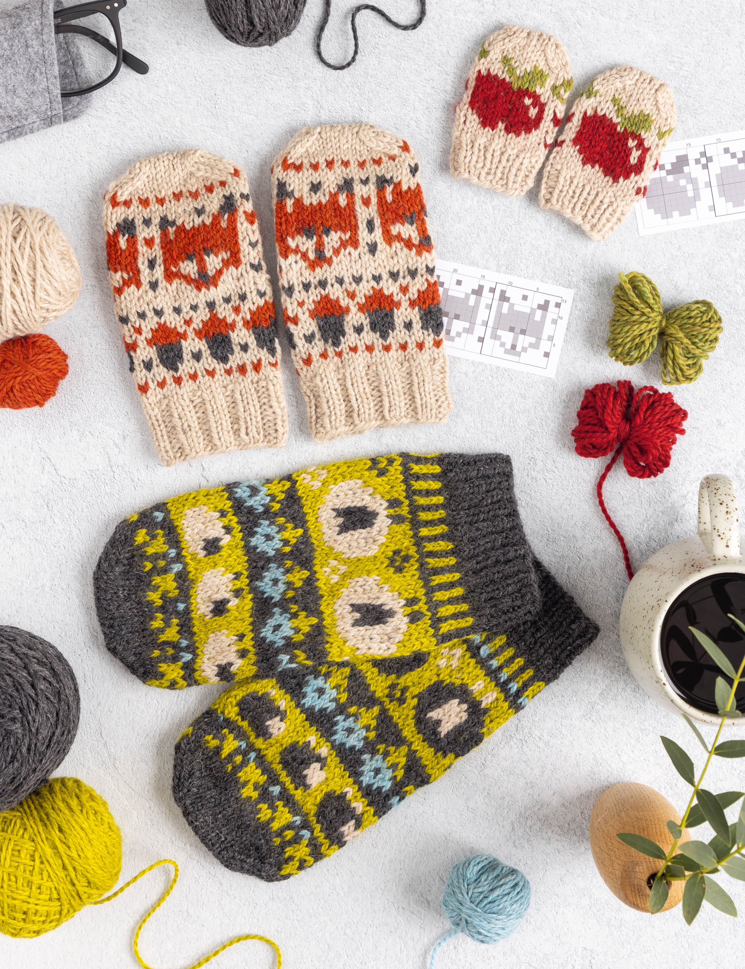 The patterns only combine two colors on each row so it's suitable for beginners to colorwork and because it's done on a small scale it's a great way for absolute beginners to try their hand at colorwork, but the large selection of patterns and designs means that more advanced knitters will have plenty to inspire them.